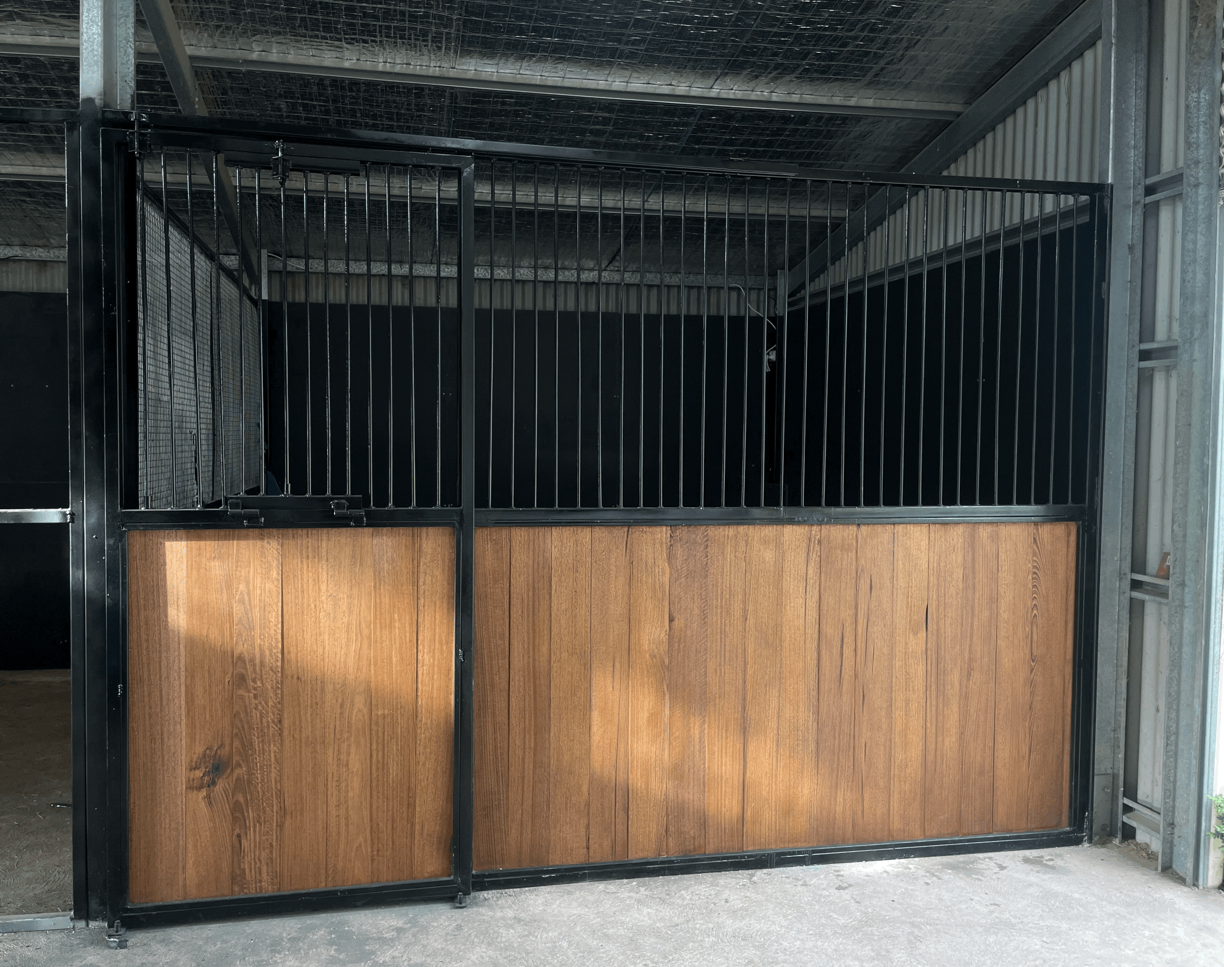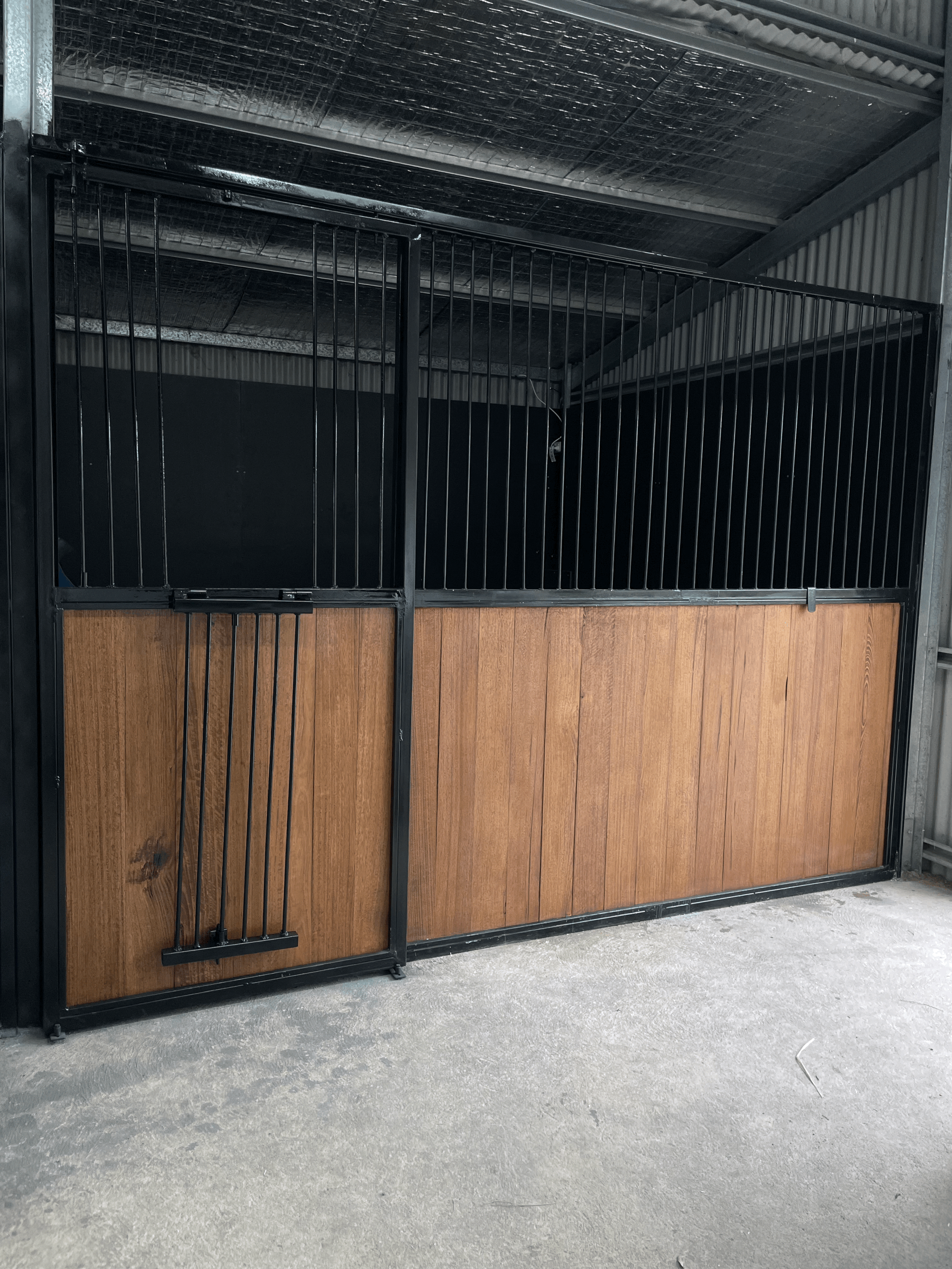 Premium stable fronts designed for strength, style, and longevity. Constructed with galvanised steel and a durable coated finish, these fronts feature 19mm Tasmanian oak hardwood panels that deliver a high-end, natural look while providing excellent wear resistance. Each unit includes a smooth sliding door, removable drop-down bars for airflow and horse visibility, and reliable, horse-safe hardware. Custom dimensions and layouts are available. price shown is for a standard 3.5 metre stable.